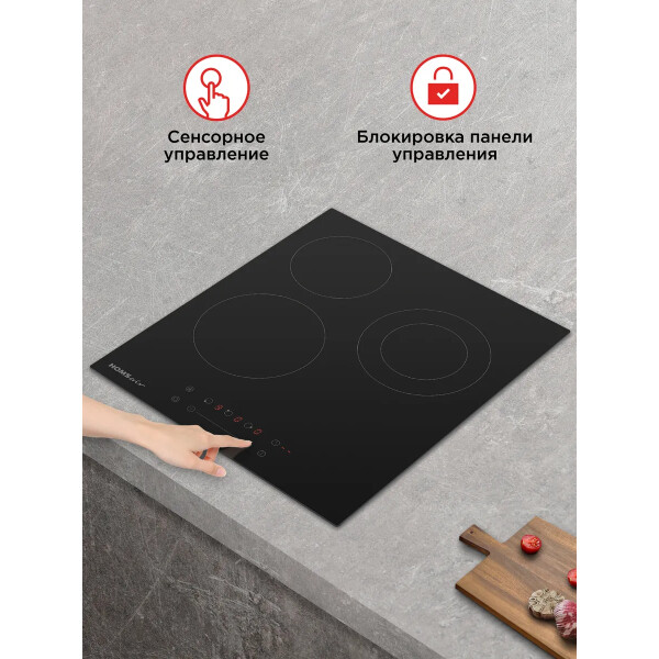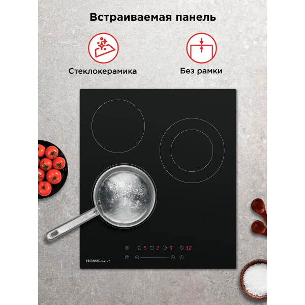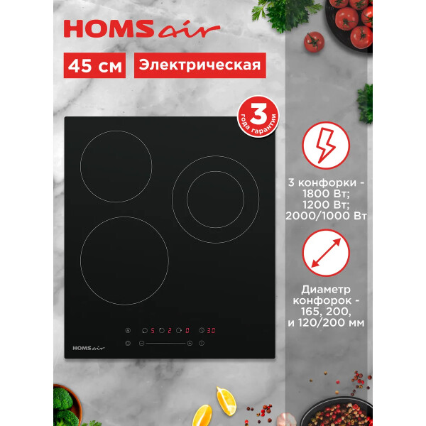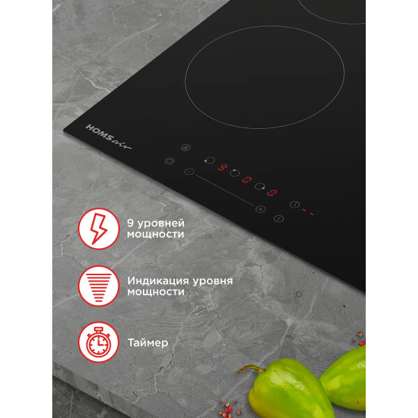 Электрическая варочная панель HOMSAIR HVY43DBK оснащена 3 конфорками идеально справится со своими функциями и, при этом, будет выглядеть очень привлекательно в интерьере кухни. Стеклокерамическая панель обеспечивает легкий уход. Особенность прибора в поддержке индикации, позволяющей определить уровень нагрева конфорок. Вы получаете возможность оптимально устройство, чтобы достичь нужного результата готовки блюда.Кнопка блокировки поверхности, а также замок от детей делают HOMSAIR HVY43DBK безопасным прибором.Благодаря встроенному таймеру вы сможете задавать время работы конфорок для каждой из них. Для управления используется сенсорная панель.