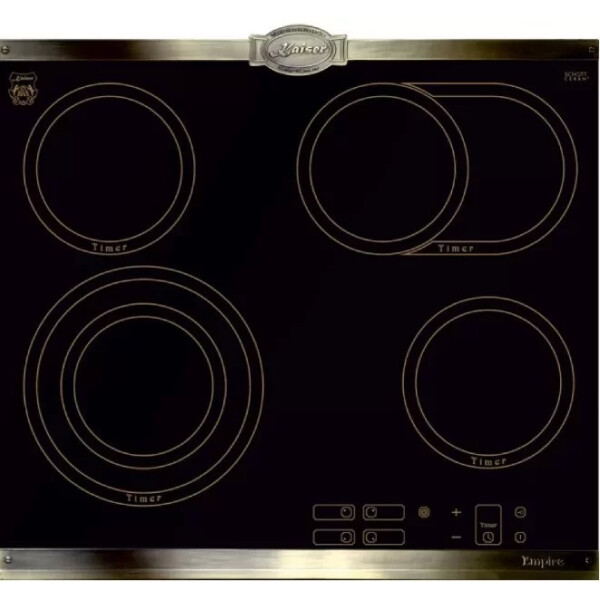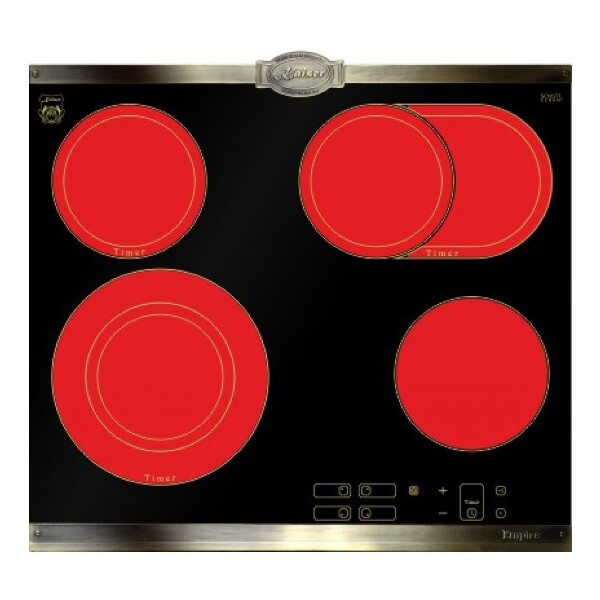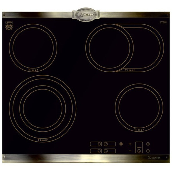 Независимая варочная поверхность Kaiser KCT 6385 Em из линейки Empire цвета антрацит выполнена из ударопрочной керамики. Украшение износостойкой графикой и твердыми бронзовыми пластинами придает панели индивидуальность. Поверхность оснащена четырьмя конфорками HiLight, одна из которых имеет двойную, а другая — овальную зону расширения.