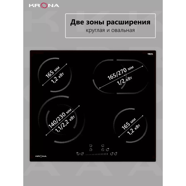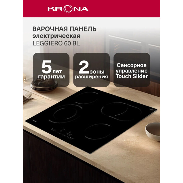 Стильная стеклокерамическая варочная поверхность LEGGIERO 60 BL порадует хозяйку не только своим дизайном, но и функциональной оснащенностью - двумя зонами нагрева с расширением: круглой до 230 мм и овальной до 270 мм, блокировкой панели управления, таймером автоотключения, защитой от перелива и перегрева, а также удобной функцией паузы Stop&Go.