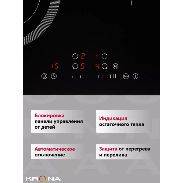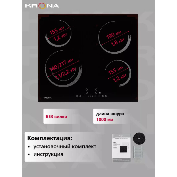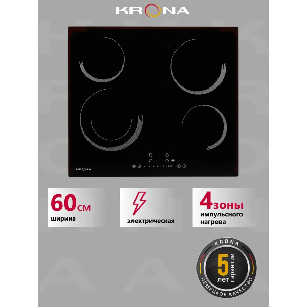 Kronasteel Orsa 60 BL- это электрическая варочная панель, с прочной стеклокерамической поверхностью. Эта модель станет идеальным решением для кухонь, выполненных в современном дизайне. Модель порадует хозяйку своей функциональной оснащенностью - зоной расширения для посуды диаметром до 217 мм, блокировкой панели управления, таймером автоотключения, защитой от перелива и перегрева. Kronasteel Orsa 60 BL отличается простым и интуитивно понятным управлением с помощью сенсорного переключения. Отсутствие традиционных кнопок облегчает уход за устройством.
