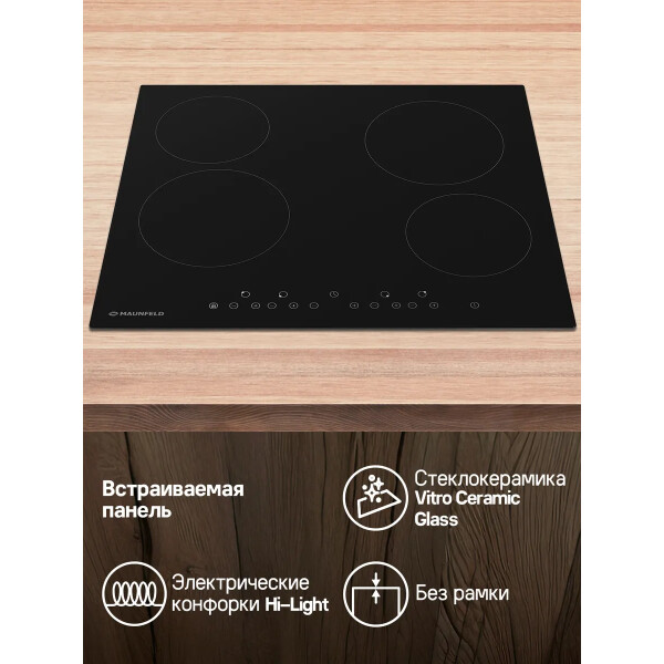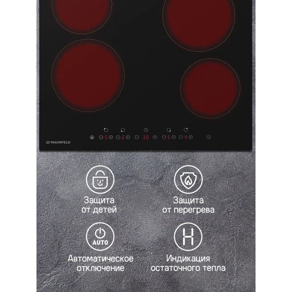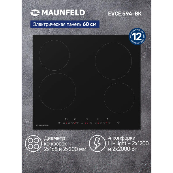 Электрическая варочная панель Maunfeld EVCE.594-BK оснащена четырьмя Hi-Light конфорками. Индикация ступеней нагрева позволяет выбрать оптимальную температуру для конкретного блюда. Также модель имеет замок от детей, что увеличивает безопасность.