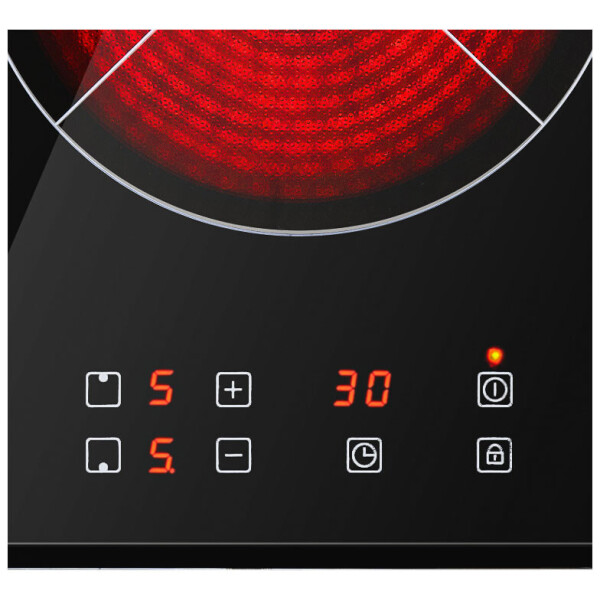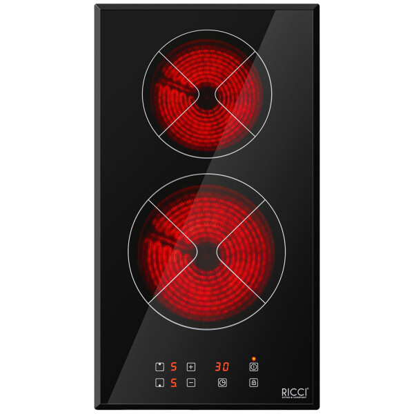 Электрическая варочная панель Ricci DTL-D23002B произведена из качественных материалов, поэтому характеризуется длительным сроком эксплуатации. Стеклокерамическая поверхность устойчива к внешнему воздействию и очищается от капель жира или других загрязнений с помощью мягкой губки и специального кремообразного средства. В конструкции модели есть две зоны нагрева типа Hi-Light, что позволяет приступить к готовке через несколько секунд после включения..Варочная панель Ricci DTL-D23002B поддерживает функцию Остаточное тепло. Горячие зоны подсвечиваются красным цветом, что помогает избежать ожогов. Сенсорный дисплей с интуитивно понятным меню предназначен для выбора оптимальной температуры, а также других параметров. Функция Защита от детей предотвращает случайное изменение заданных параметров и обеспечивает безопасную эксплуатацию устройства. Модель отключается при перегреве, перепадах напряжения и других неполадках в электросети.
