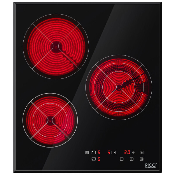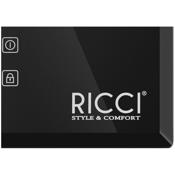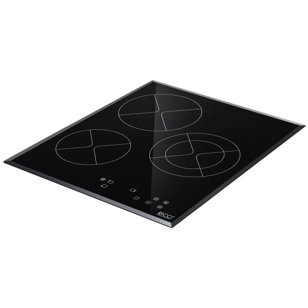 Электрическая варочная поверхность Ricci одна из немногочисленных моделей, оснащенных тремя конфорками. Они вместе с блоком управления расположены так, чтобы для посуды оставалось как можно больше места. Нагревательные элементы ленточные, поэтому можно использовать любую посуду: от чугунной до стеклянной.