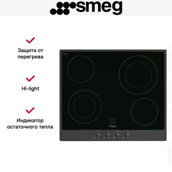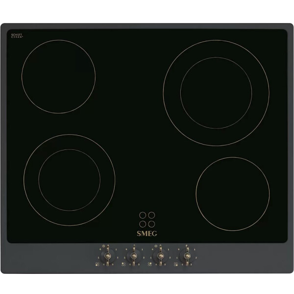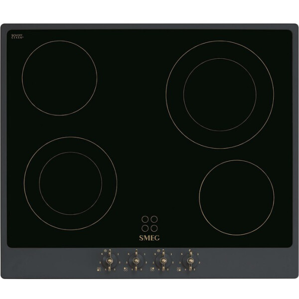 Варочная панель SMEG P864AO из серии Coloniale выполнена из черной стеклокерамики Suprema и дополнена рамкой цвета «антрацит». Данная модель оснащена 4 конфорками Hi-Light, 2 из которых — двухконтурные, что позволяет выбирать зону нагрева в зависимости от диаметра используемой посуды. С помощью поворотных переключателей настроить работу устройства можно быстро и легко. Безопасность эксплуатации гарантирует защита от перегрева.