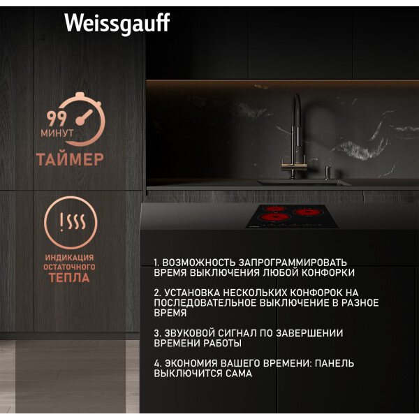 Таймер, использующийся в стеклокерамических панелях Weissgauff, является многофункциональным. Он может работать как в режиме напоминания, издавая звуковой сигнал через отведенное время, так и в режиме отключения. Причем, в режиме отключения вы можете задать, одну или несколько конфорок вы хотите выключить, и определить для каждой из них своё собственное время.