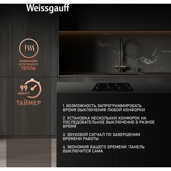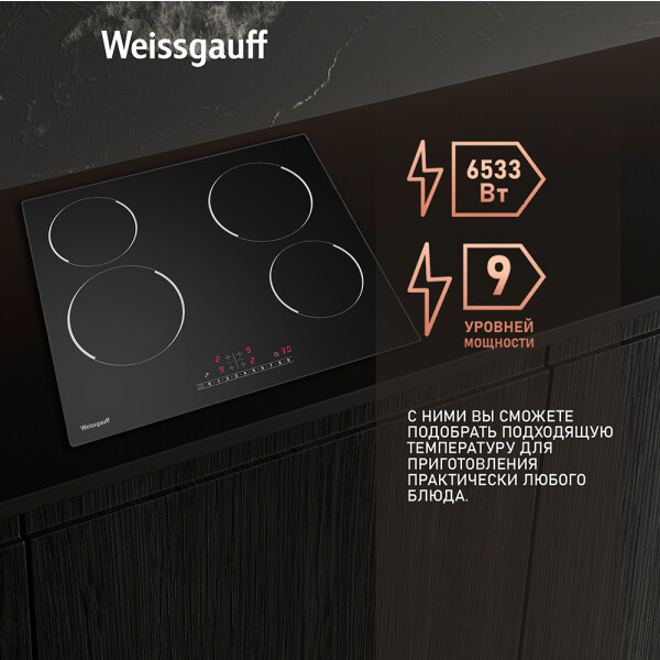 Стеклокерамическая варочная панель Weissgauff с особым дизайном конфорок Glide-Zone гармонично впишется в дизайн вашей кухни, а чувствительное сенсорное управление со слайдером позволит всего в одно касание задать необходимый уровень нагрева для любой из конфорок.