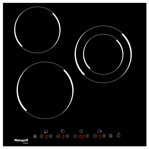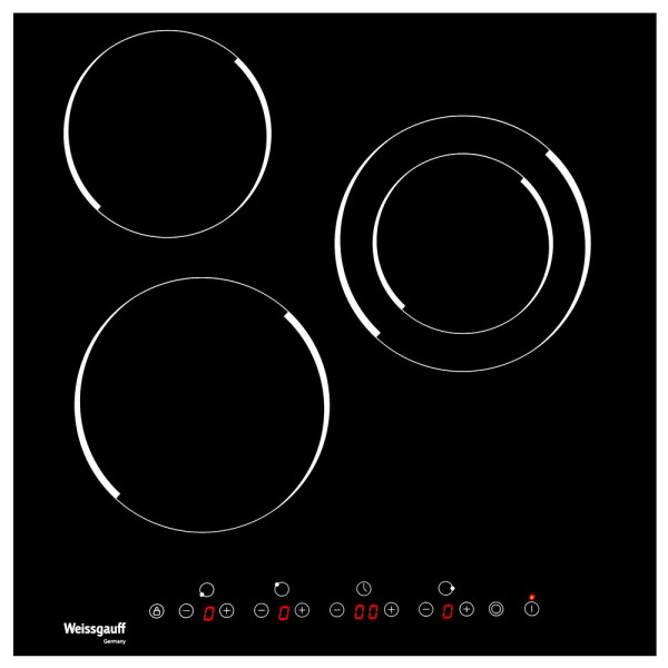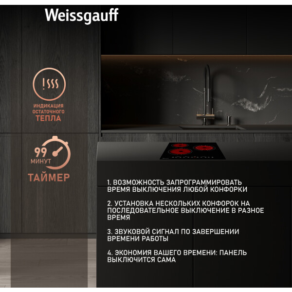 Таймер, использующийся в стеклокерамических панелях Weissgauff, является многофункциональным. Он может работать как в режиме напоминания, издавая звуковой сигнал через отведенное время, так и в режиме отключения. Причем, в режиме отключения вы можете задать, одну или несколько конфорок вы хотите выключить, и определить для каждой из них своё собственное время.
