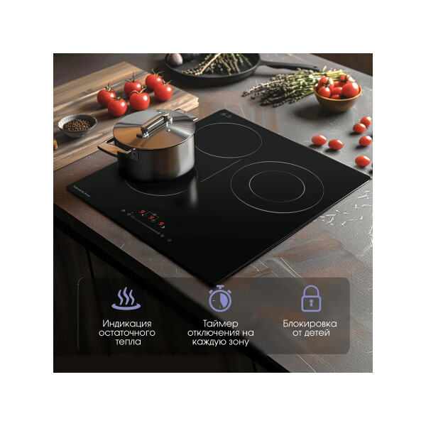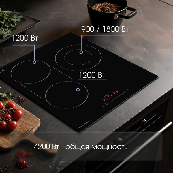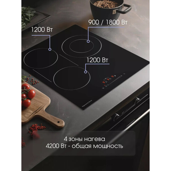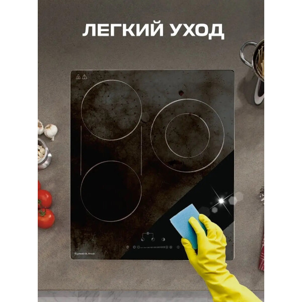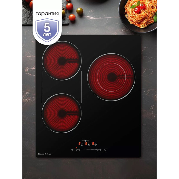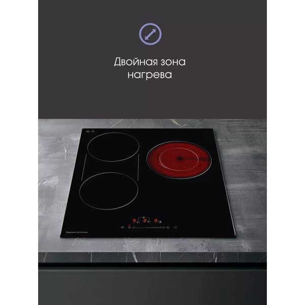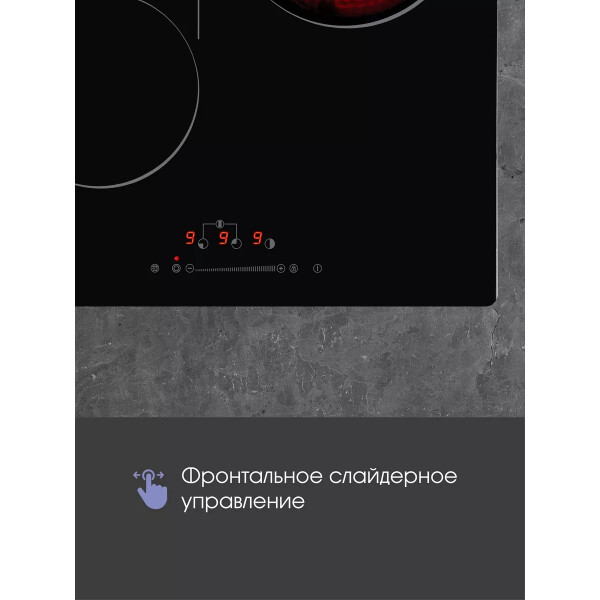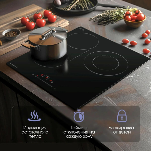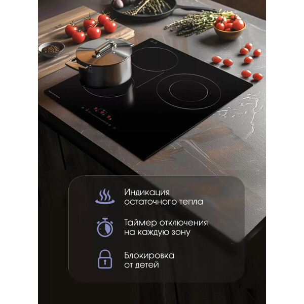 Девять уровней мощности позволяют настраивать интенсивность нагрева простым прикосновением кнопок на сенсорной панели. Функция блокировки панели помогает предотвратить изменение настроек. Индикация остаточного тепла обезопасит пользователей от образования ожогов. Панель из стеклокерамики черного цвета характеризуется стойкостью к механическим повреждениям и простотой в уходе.