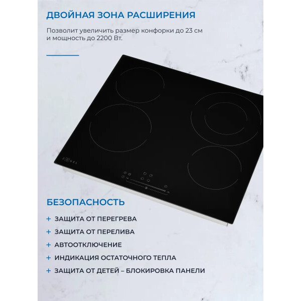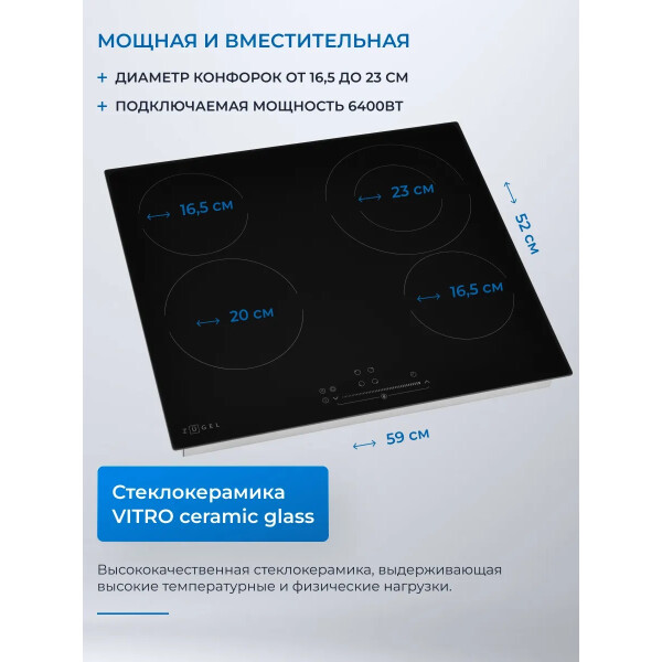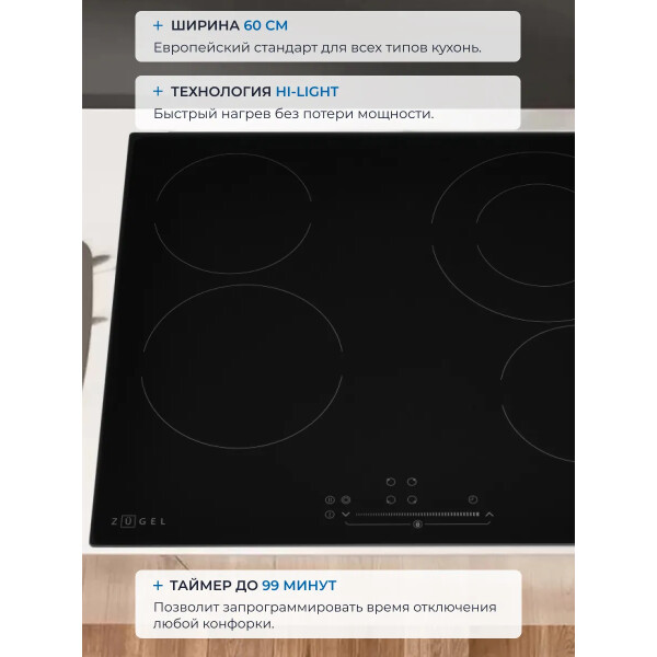 Варочная панель ZUGEL ZEH602B, исполненная в черной стеклокерамике Vitro Ceramic Glass - это идеальное сочетание недорогой цены и расширенных возможностей в одной модели.