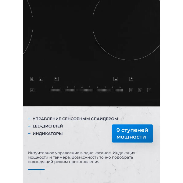 Блок управления-слайдер, позволяющий всего в одно касание выставить необходимый вам уровень нагрева любой из конфорок и делающий процесс управления панелью значительно более быстрым и легким;