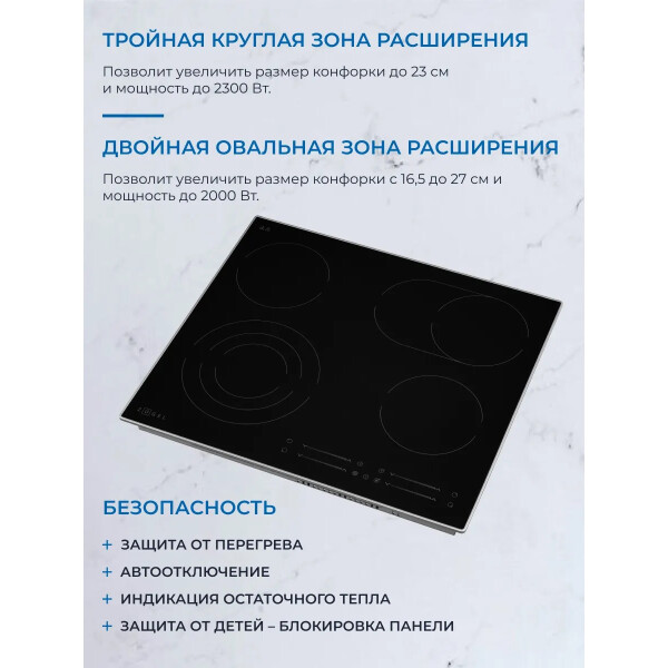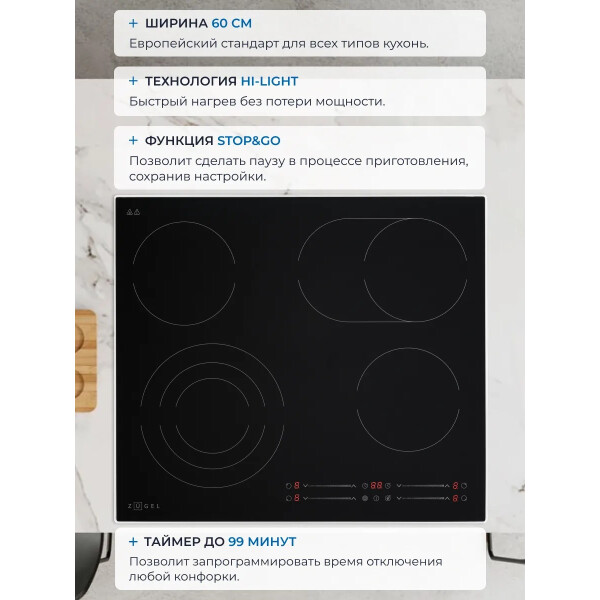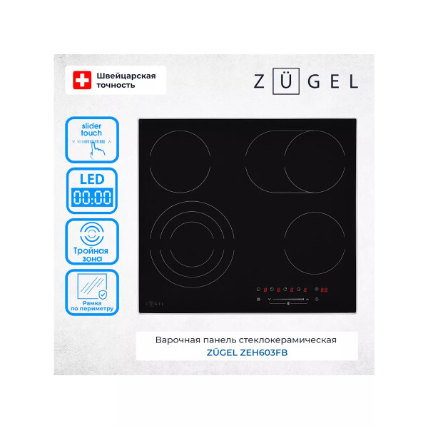 Варочная панель ZUGEL ZEH603FB, исполненная в черной стеклокерамике Vitro Ceramic Glass - это идеальное сочетание недорогой цены и расширенных возможностей в одной модели.