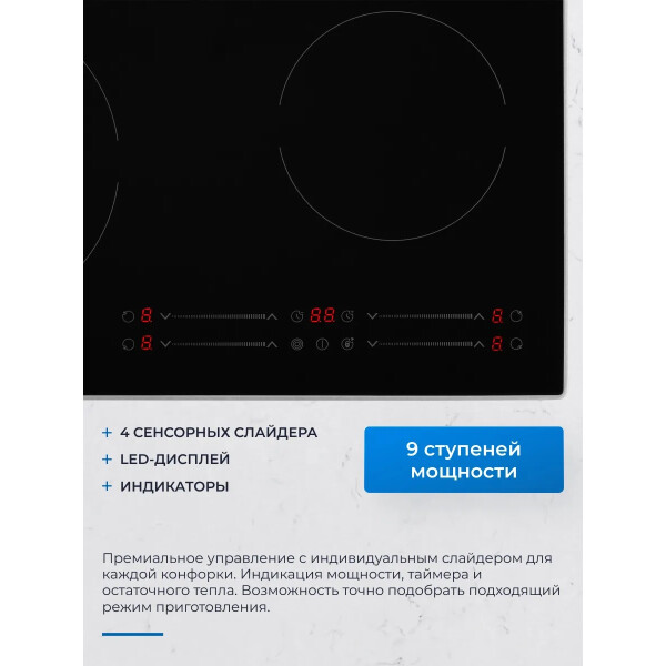 Блок управления-слайдер, позволяющий всего в одно касание выставить необходимый вам уровень нагрева любой из конфорок и делающий процесс управления панелью значительно более быстрым и легким;
