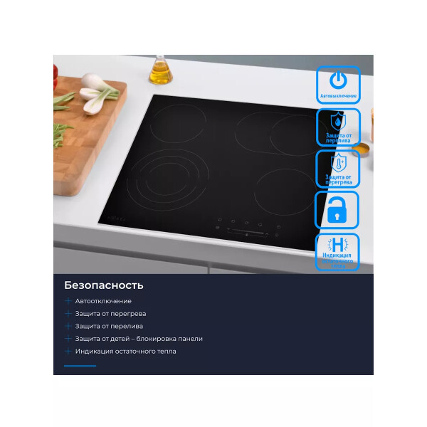 Защитное автоотключение - это дополнительный уровень безопасности, который гарантирует высокую степень защиты для вас и вашего дома, обеспечивая самостоятельное отключение конфорки;