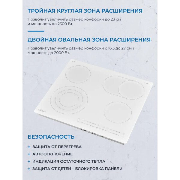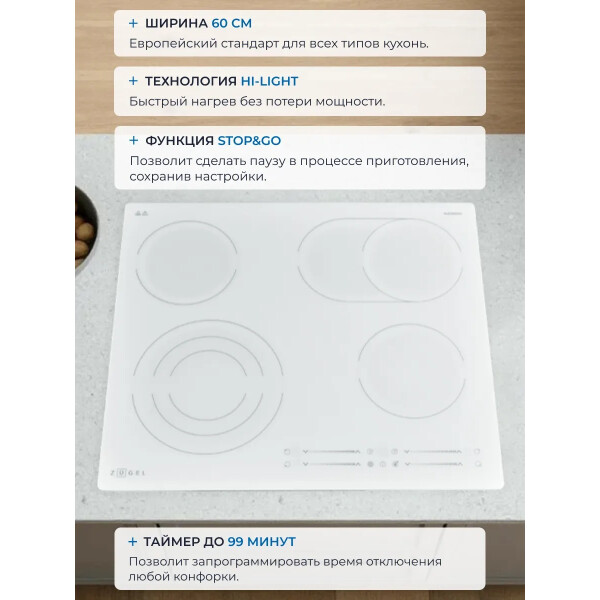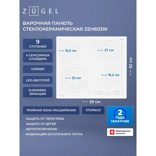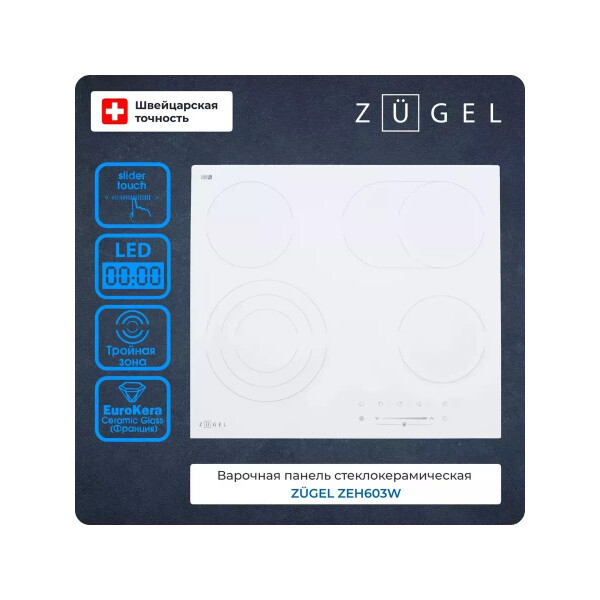 Варочная панель ZUGEL ZEH603W, исполненная в белой стеклокерамике EuroKera (Франция) - это идеальное сочетание недорогой цены и расширенных возможностей в одной модели.