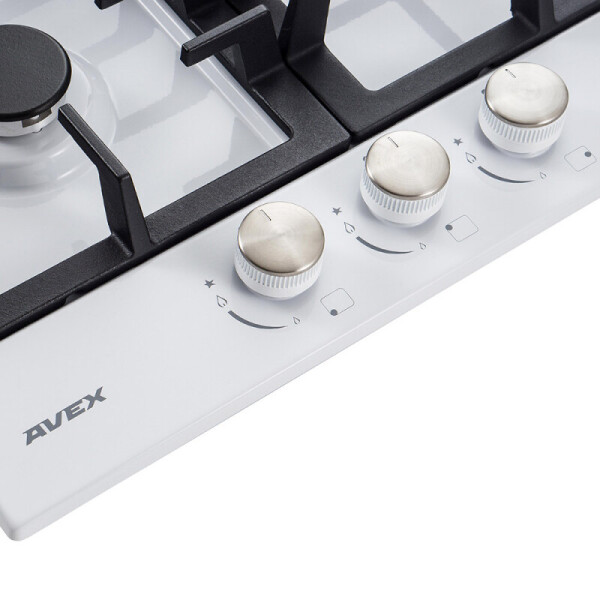 Встраиваемая независимая газовая панель Avex HS 4532 W модель, оснащенная тремя конфорками (две с одной стороны и одна с другой) мощностью 1 кВт, 1,8 кВт и 3,4 кВт.