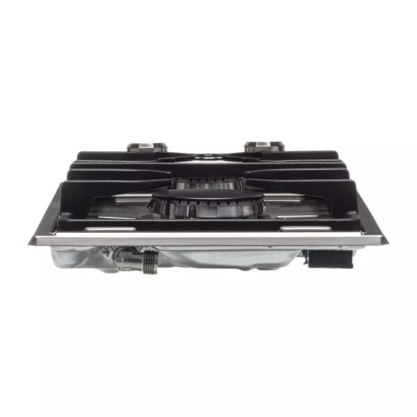 Две поворотные ручки, при помощи которых регулируется мощность пламени, предусматривают встроенный электроподжиг. С его помощью варочная поверхность автоматически поджигает газ от электрической искры.