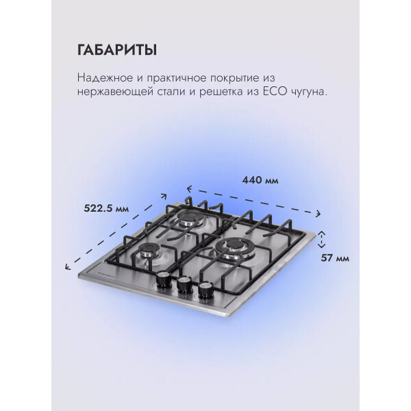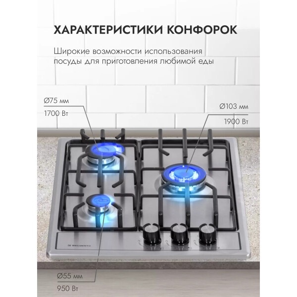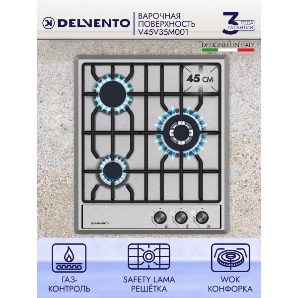 Независимая встраиваемая газовая панель Delvento V45V35M001 оснащена тремя конфорками с электрическим поджигом.