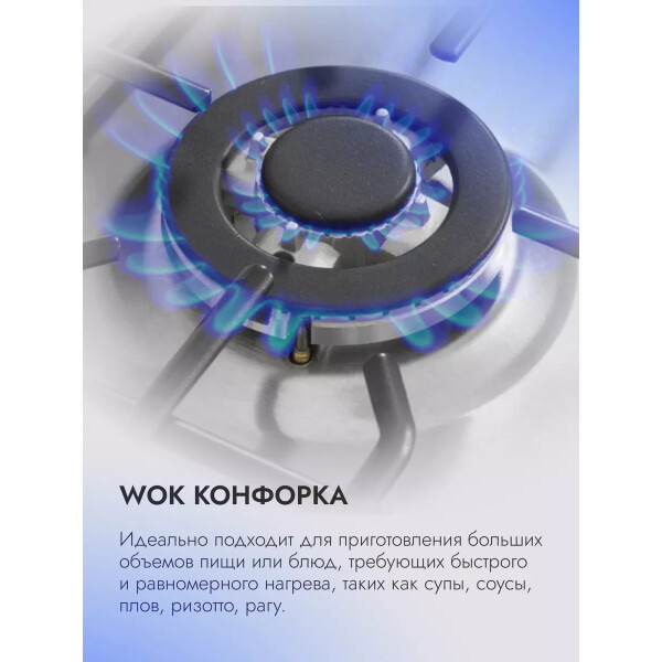 Есть Wok-горелка с увеличенной мощностью. Искра, которая подается автоматически при включении, устраняет необходимость использования спичек и зажигалок. Панель сделана из высококачественной эмалированной стали.