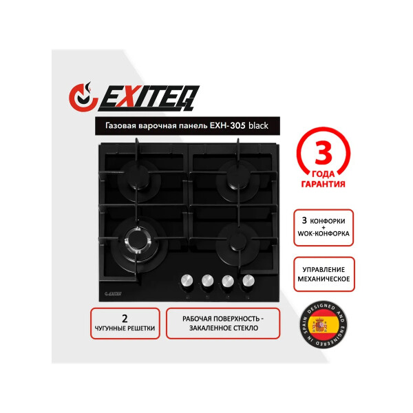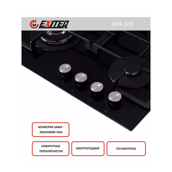 Встраиваемая газовая варочная панель Exiteq EXH-305 это стильная и минималистичная модель. На гладкой поверхности из закаленного стекла расположены четыре конфорки различной мощности с индивидуальными чугунными держателями. Газ-контроль и автоматический электроподжиг делают прибор удобным и безопасным.