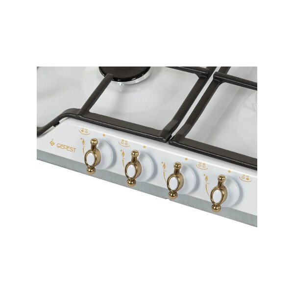Газовая варочная панель Гефест с покрытой эмалью белого цвета с рисунком ретро поверхностью, ширина 59 см. Несмотря на скромные размеры, варочная поверхность укомплектована системой газ-контроля, перекрывающего подачу газа при случайном угасании пламени. А чтобы не загасить газовую горелку, предусмотрено фиксированное положение переключателя для экономного горения. Электророзжиг встроен в поворотные ручки и включается автоматически. Две средние конфорки, малая и большого диаметра обеспечивают возможность использовать разную посуду для приготовления, а две составные чугунные решетки выдерживают тяжесть большой кастрюли без проблем. Эксплуатация не вызовет затруднений, управление - простое.