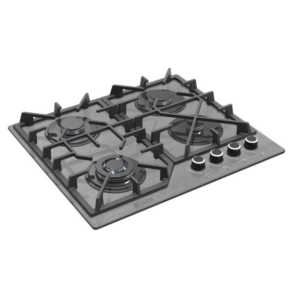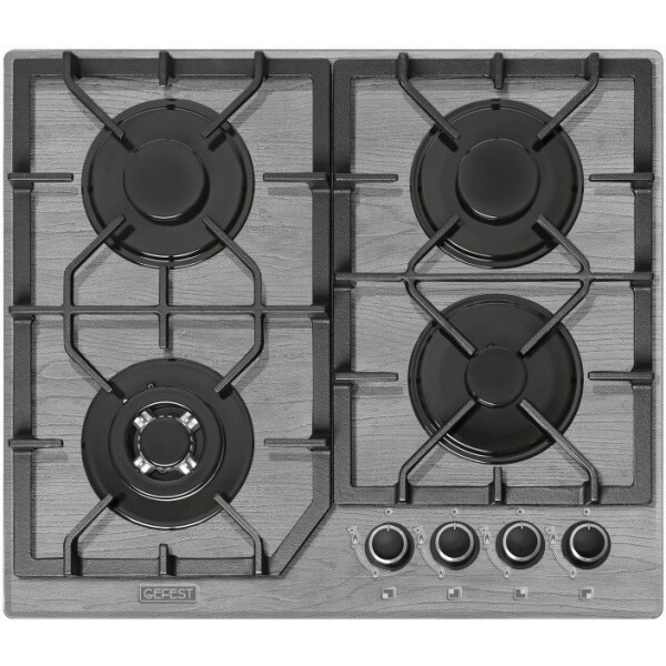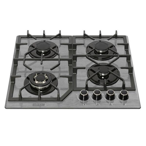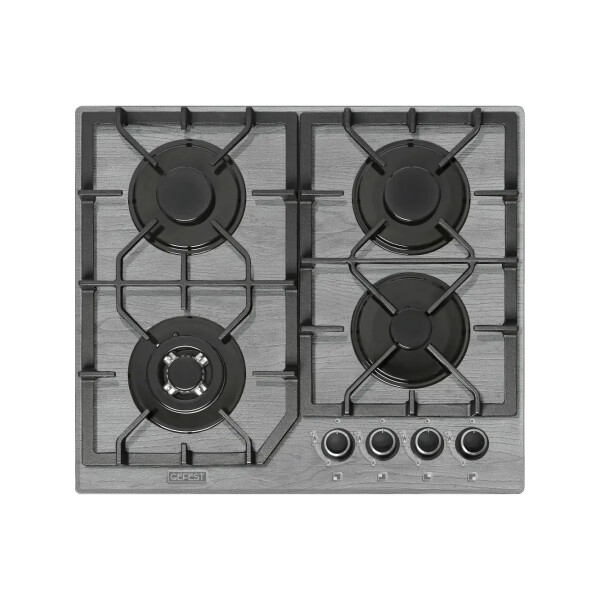 Варочная панель в сером цвете с рисунком "дерево", со стеклянной поверхностью и составными фигурными решетками из чугуна. Конфорок - четыре, от малой и экономичной до двухзонной, с мощным и быстрым нагревом. Панель управления смещена в правую часть, выступающие элементы - декорированы, с встроенным электроподжигом. Каждая горелка оснащена системой газ-контроля, для экономичного горения пламени предусмотрено фиксированное положение рукоятки выключателя - режим "малое пламя".