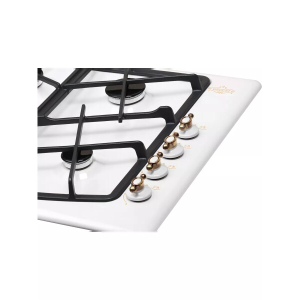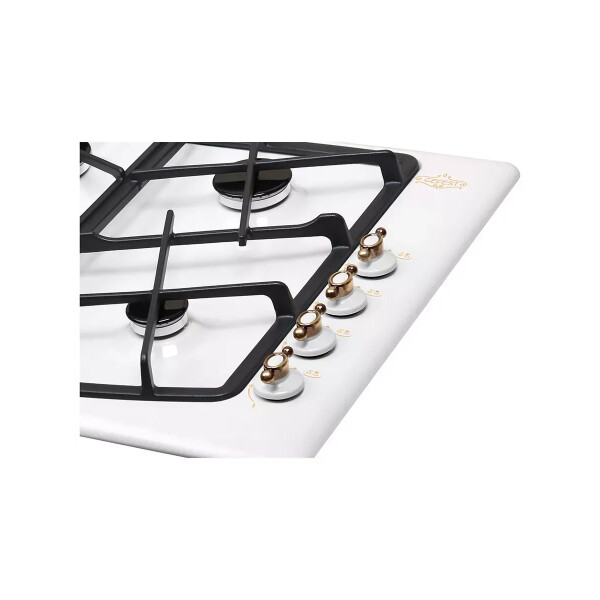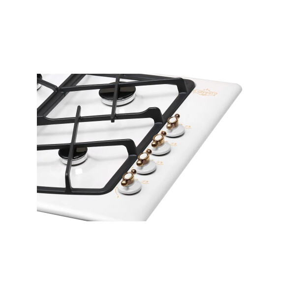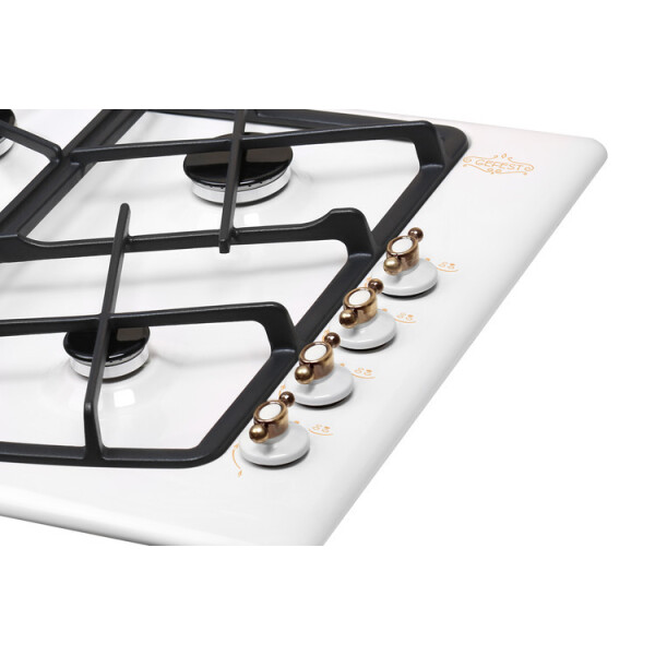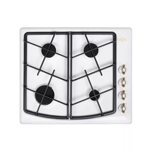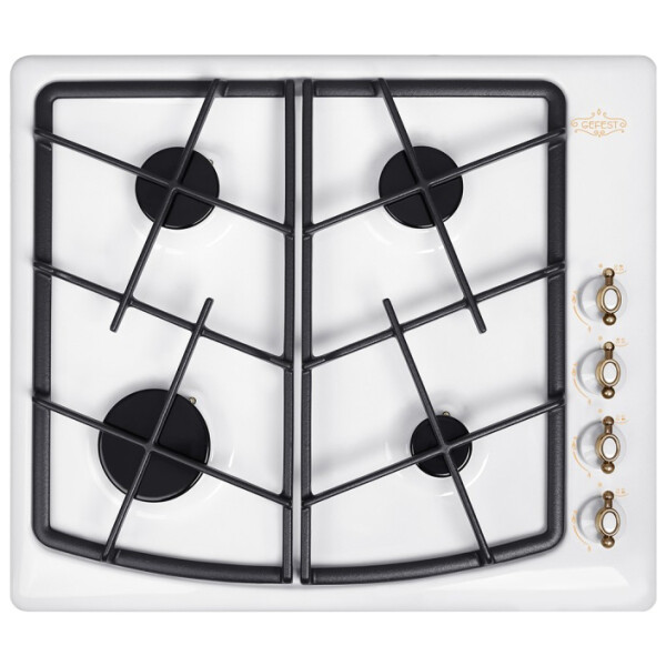 Газовая варочная панель Гефест выполнена в белом цвете и покрыта прочной эмалью, ширина 59 см. Элементы управления декорированы, нанесен рисунок в ретро-стиле. Несмотря на скромные размеры, панель укомплектована системой газ-контроля, перекрывающего подачу газа при случайном угасании пламени. А чтобы не загасить газовую горелку, предусмотрено фиксированное положение переключателя для экономного горения. Электроподжиг встроен в поворотные ручки и включается автоматически. Две средние конфорки дополнены горелками малого и большого диаметра, обеспечивают возможность использовать разную посуду для приготовления, а составные чугунные решетки выдерживают тяжесть большой кастрюли без проблем. Эксплуатация не вызовет затруднений, управление - простое.