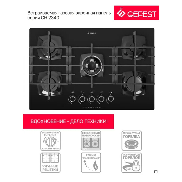 Варочная поверхность Gefest СН 2340 получила полностью механическое управление, реализованное с помощью размещенных в углу панели поворотных ручек. Каждый переключатель связан с системой электроподжига и позволяет безопасно и быстро разжечь огонь в нужной конфорке, для этого достаточно всего лишь нажать на него. Стильная внешне варочная поверхность с панелью из черного закаленного стекла снабжена системой газ-контроля, которая предотвращает любые утечки газа.