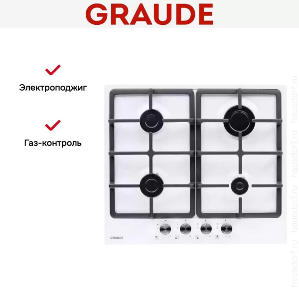 Газовая варочная панель Graude GS 60.1 WM в белом цвете органично смотрится в интерьере кухни. Поворотные переключатели в тон рабочей поверхности подчеркивают эстетичный внешний вид модели и повышают удобство управления. Прибор оснащен четырьмя конфорками разной мощности. Автоматический электроподжиг позволяет разжечь газовую горелку одним поворотом переключателя, без спичек и зажигалки, что гарантирует удобство и безопасность использования.