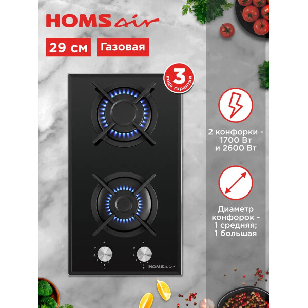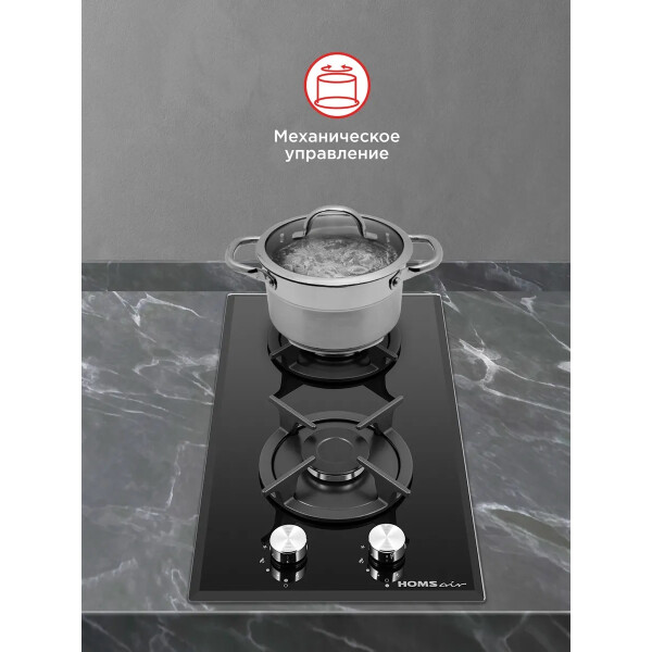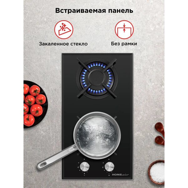 Встраиваемая газовая варочная панель HOMSair HGG321BK с двумя конфорками. Благодаря компактным размерам отлично подойдет для любой кухни.При помощи поворотных переключателей можно выбрать подходящий режим приготовления. Электроподжиг, встроенный в рукоятки, избавит от использования зажигалок. Функция газ-контроль обезопасит вас, если пламя случайно погасло.
