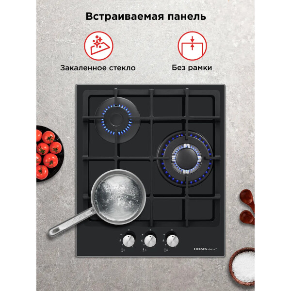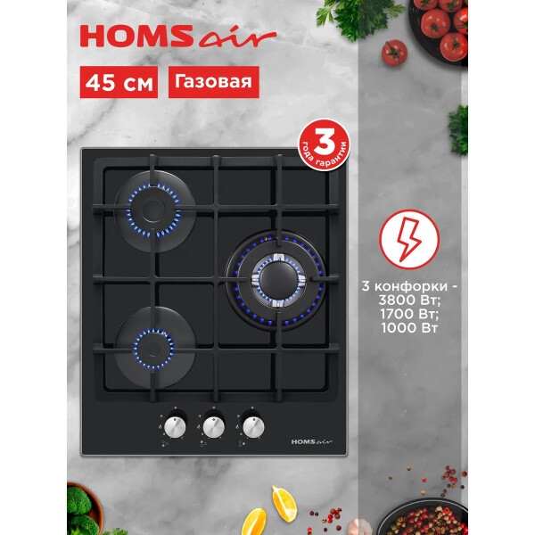 Встраиваемая газовая варочная панель HOMSair HGG433TGCBK имеет 3 конфорки разной мощности, которые позволяют быстро приготовить различные блюда. Максимальную безопасность при работе обеспечивают устойчивые чугунные решетки и система газ-контроль, которая предотвращает подачу газа в случае задувания пламени.