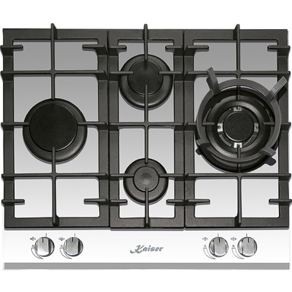 Встраиваемая газовая варочная панель Kaiser KCG 6394 W Turbo Romb выполнена из белого закалённого термостойкого стекла, по своей прочности не уступающего стеклокерамике. Скошенный передний край делает панель более привлекательной по дизайну. Газовая панель отличается лёгкостью очистки, оснащена газ-контролем, бесступенчатым управлением и встроенным автоподжигом горелок в ручках. Элегантные эргономичные ручки управления изготовлены из нержавеющей стали. Все решетки, крышки конфорок и подставки выполнены из чугуна.