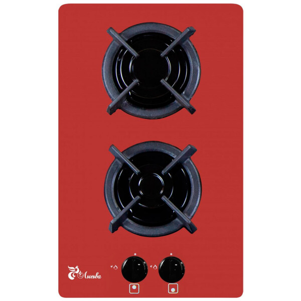 Встраиваемая независимая газовая панель Лысьва GR0200G00, красная модель с двумя конфорками, мощность передней составляет 1,5 кВт, задней 2,3 кВт. Поворотные регуляторы расположены по центру в передней части корпуса, в них встроен электроподжиг.