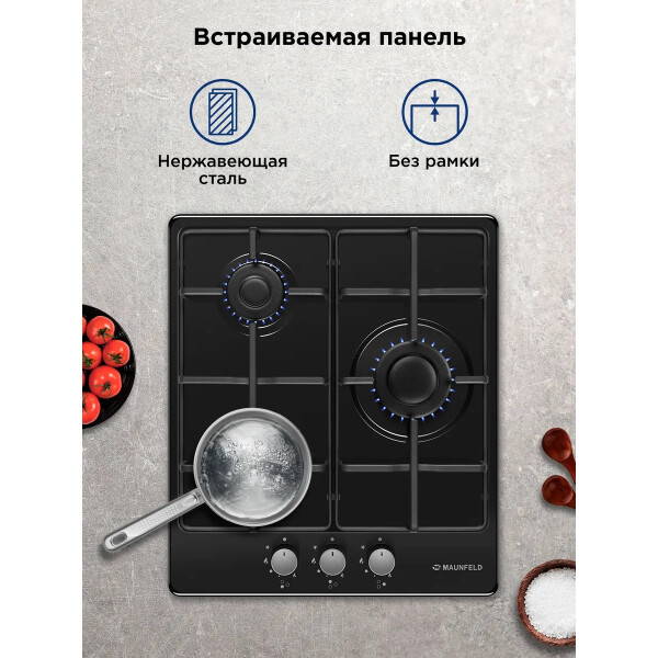 Встраиваемая газовая варочная панель Maunfeld EGHE.43.3STS-EB имеет автоматический электроподжиг, который расположен в ручке конфорки. Высококачественная эмаль поверхности устойчивая к внешним воздействиям.