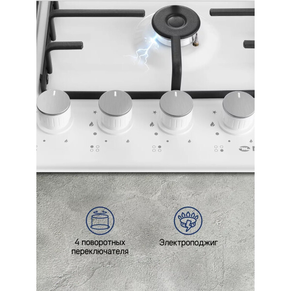 Регулирование подачи газа и электроподжиг конфорок происходит с помощью поворотных ручек из термостойкой пластмассы. Для простоты использования около каждой ручки нанесены информационные изображения: используемая конфорка, подача газа выключена, электроподжиг, максимальное пламя и минимальное пламя.