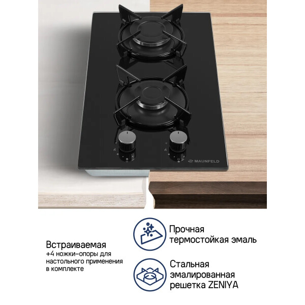 Дизайнерская компактная газовая варочная панель шириной 30 см поместится даже на небольшой кухне. Она не только встраивается в столешницу, но и может использоваться как отдельностоящая плита, благодаря 4 ножкам-опорам, которые идут в комплекте. Работает от магистрального газа и газа в баллоне (тип G30). Для этого достаточно поставить специальные жиклеры французской фирмы SOURDILLON.