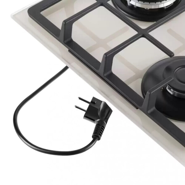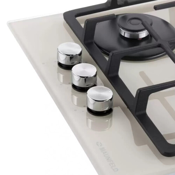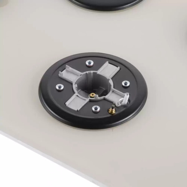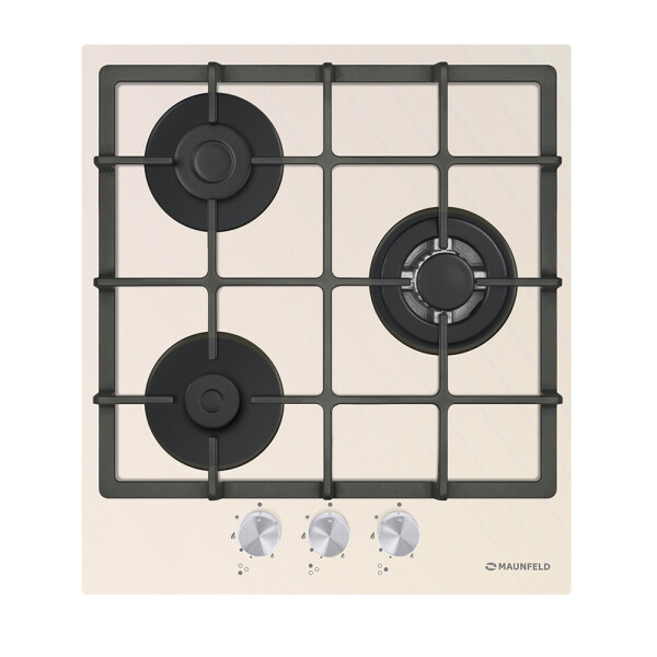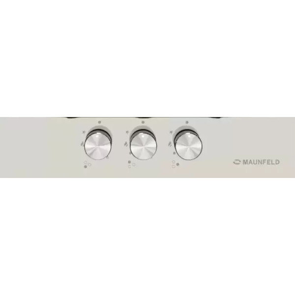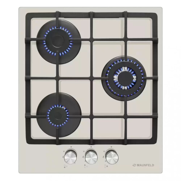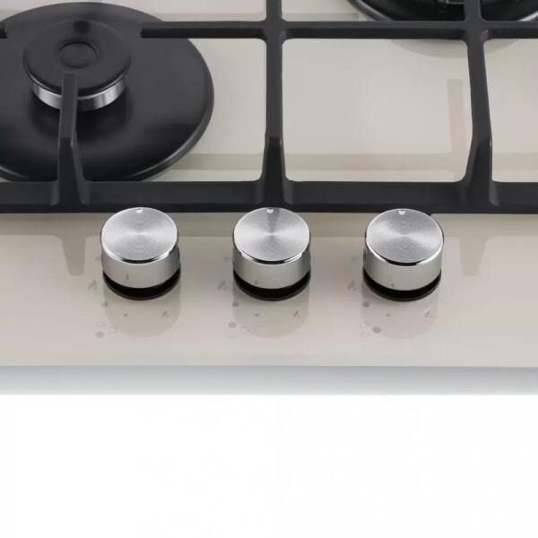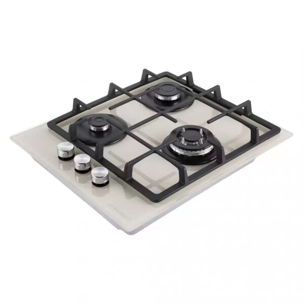 3 газовые итальянские конфорки SABAF: одна быстрая WOK конфорка 3800W, две полу быстрых конфорки 1700W и 1000W. Фронтальное управление, 3 круглых металлических поворотных переключателя (D35мм), автоматический электроподжиг под ручкой управления, возможность работы от магистрального газа и газа в баллоне (тип G30).