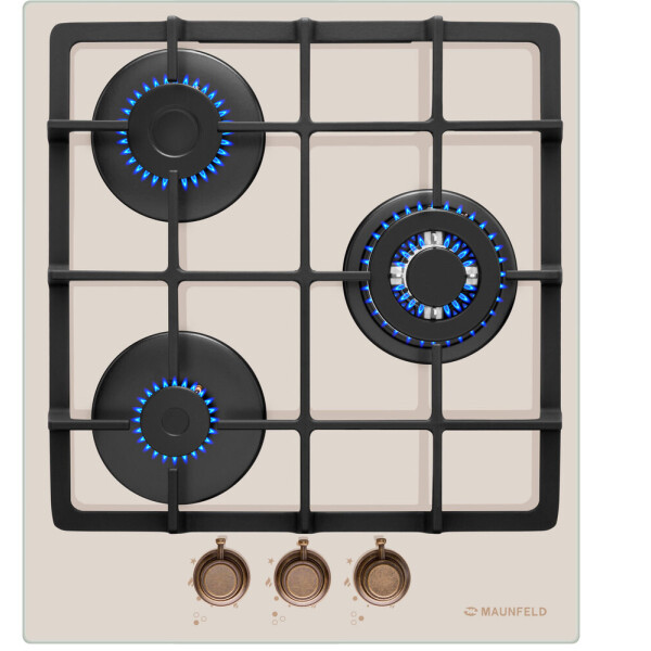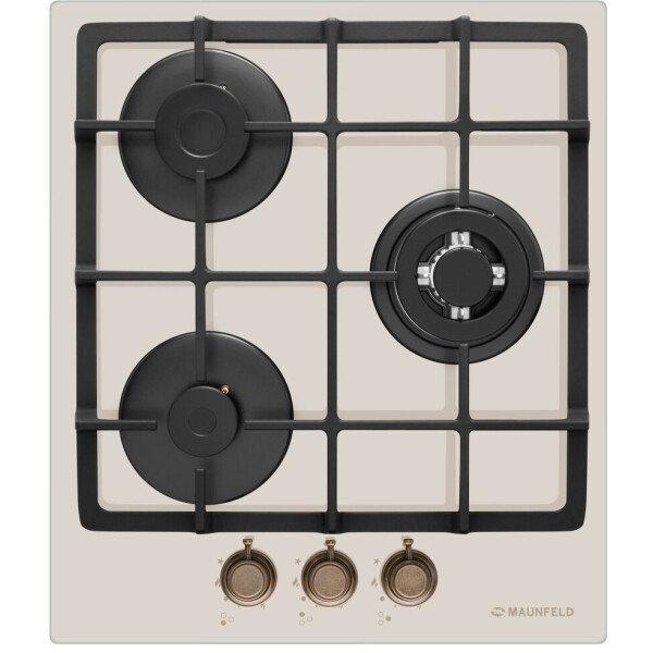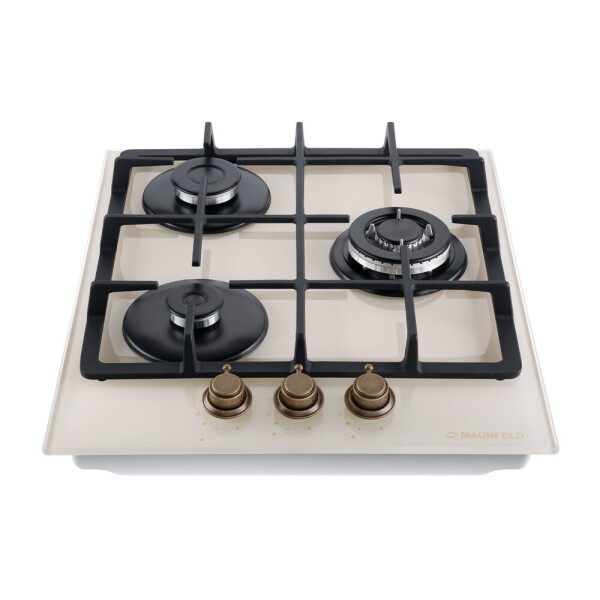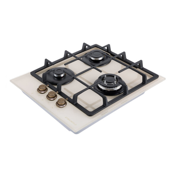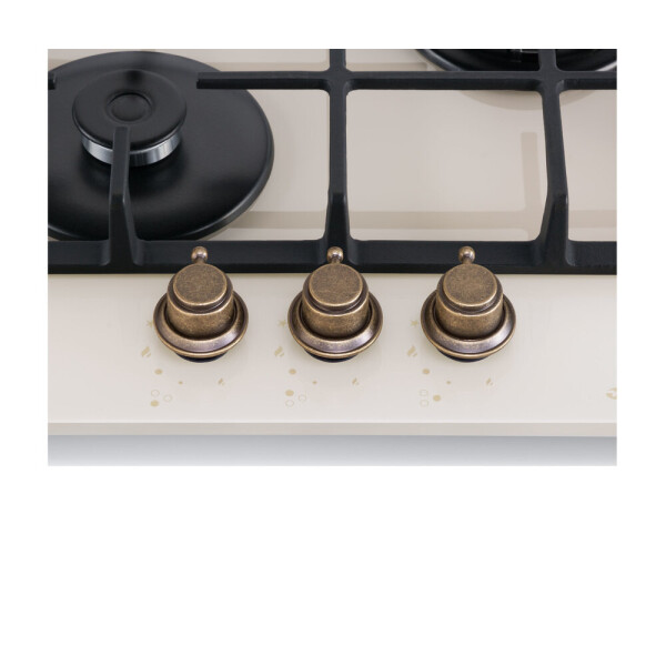 Панель в ретро-стиле выполнена из нержавеющей стали, покрытой термостойкой прочной эмалью бежевого цвета. В данной модели установлены итальянские горелки Sabaf. Две стандартные конфорки мощностью 1000 Вт, 1700 Вт и одна мощная WOK-конфорка с двойным пламенем мощностью 3000 Вт.