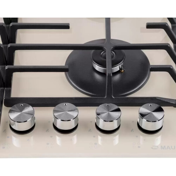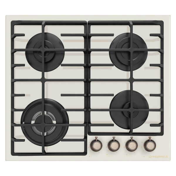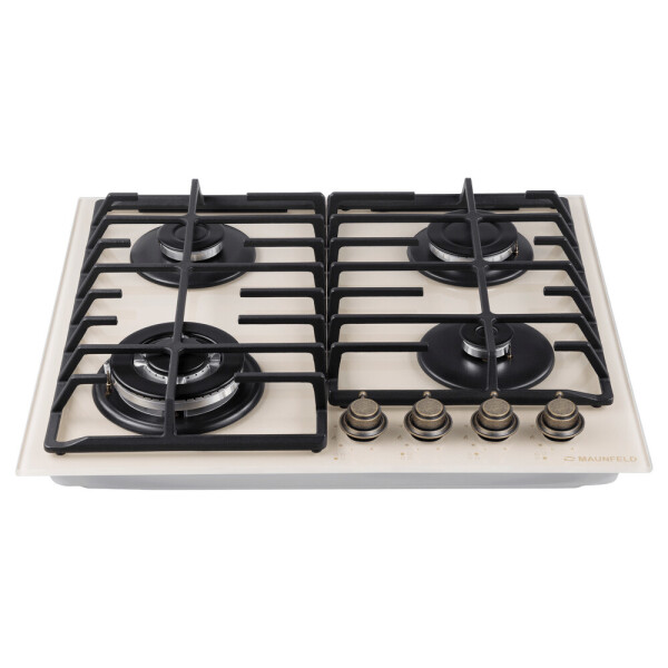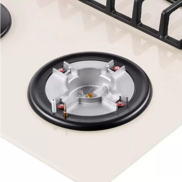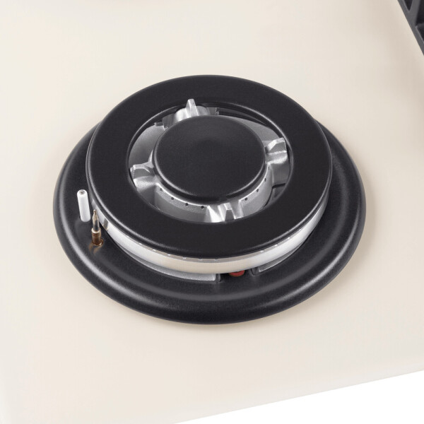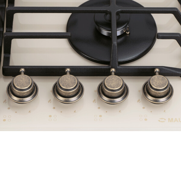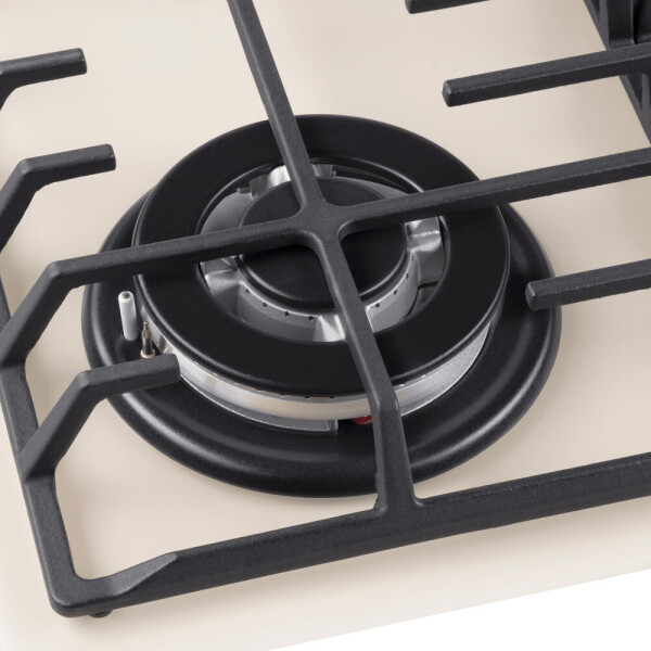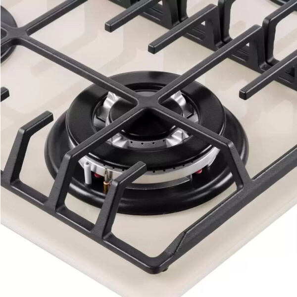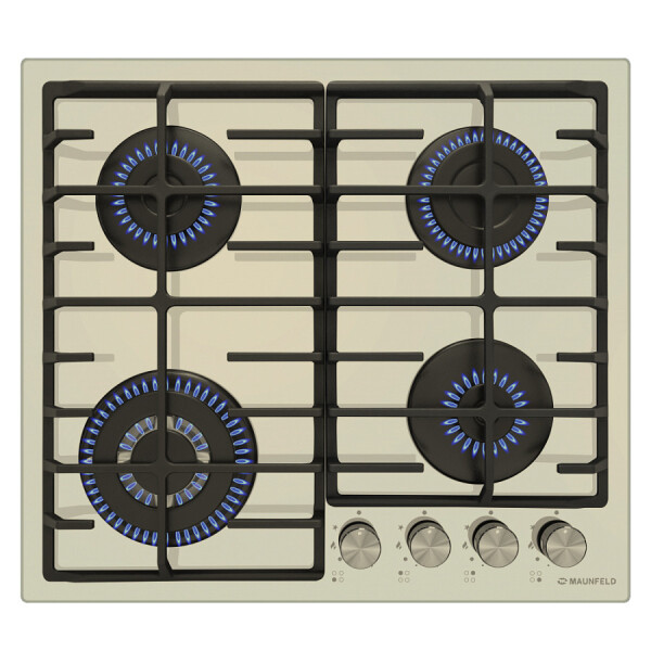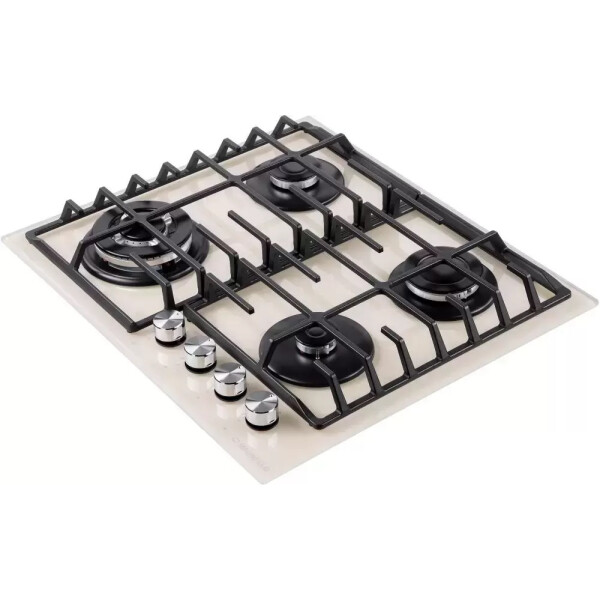 4 газовые итальянские конфорки: 3800, 1700, 1700, 1000 Вт. Фронтальное управление, 4 поворотных переключателя, автоматический электроподжиг под ручкой управления, возможность работы от магистрального газа и газа в балоне (тип G30).