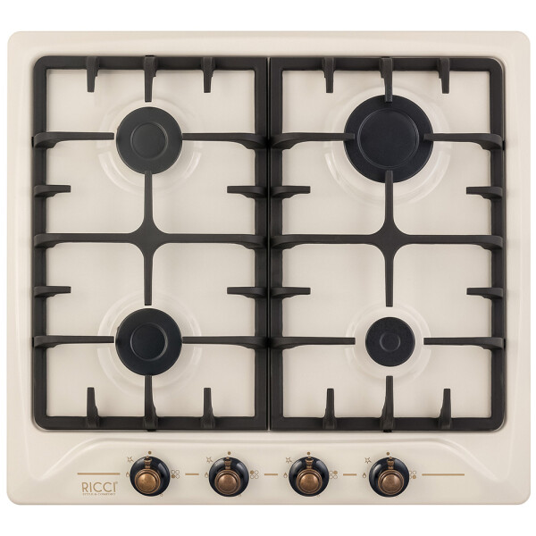 Встраиваемая газовая варочная панель Ricci RGN611BG - подходящее решение для кухни в классическом стиле. Изящная отделка поворотных регуляторов, спокойный бежевый цвет, слегка скругленные углы - дизайн лаконичен и элегантен.