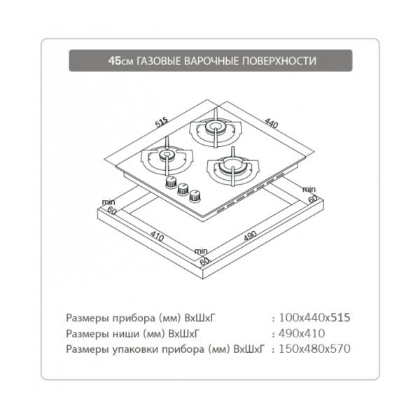 Варочная поверхность имеет ширину 45 см. Узкая бытовая техника – идеальное решение для небольших кухонь. Данная модель имеет три конфорки, их достаточно для приготовления еды для семьи из четырех человек, т.к. одновременно используется только три конфорки. Благодаря независимой конструкции панель может быть размещена в любом месте независимо от расположения духового шкафа.