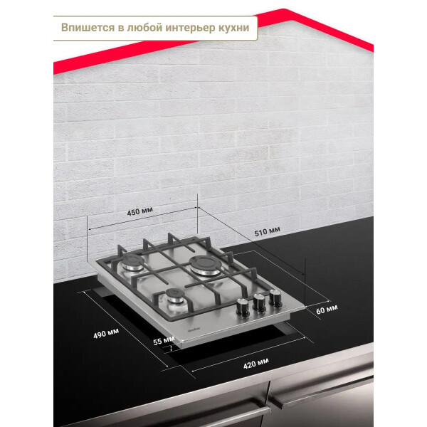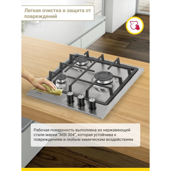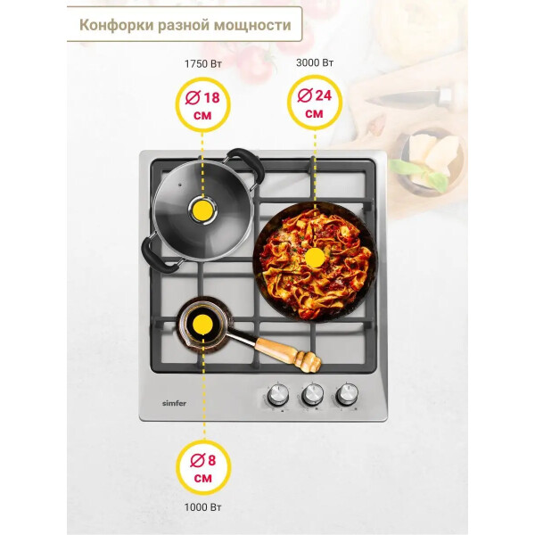 Газовая варочная панель Simfer H45V30M416 - модель, которая благодаря своим компактным размерам органично впишется в интерьер вашей кухни и сделает ежедневный процесс приготовления еды комфортным. Рабочая поверхность выполнена из прочного и долговечного материала. На ней располагаются три конфорки - разные по диаметру и мощности пламени в них. А значит вы сможете выбрать оптимальную конфорку для приготовления разнообразных блюд. В поворотные переключатели встроен электроподжиг, который значительно упрощает работу с панелью.
