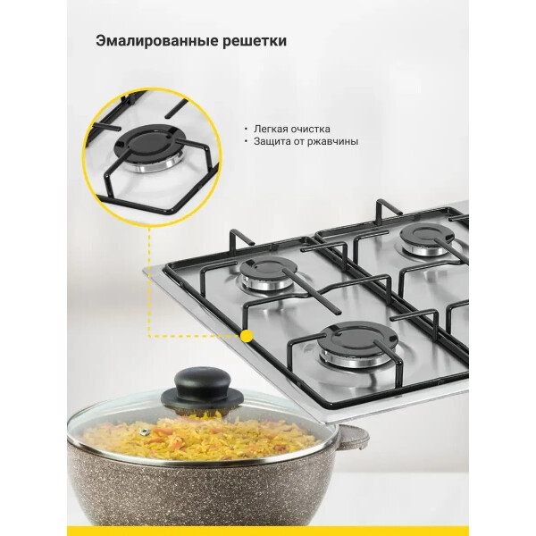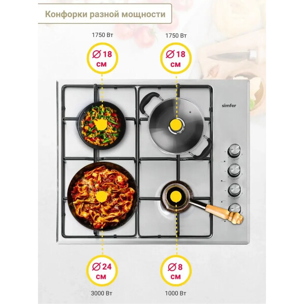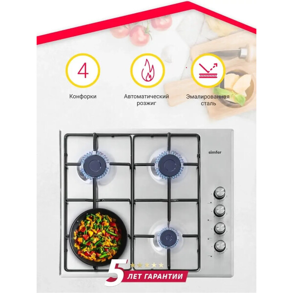 Газовая варочная поверхность Simfer H60Q40M411 выполнена из нержавеющей стали. Поворотные переключатели делают управление быстрым и простым. Модель имеет 4 конфорки, одна из которых повышенной мощности. Составная решетка из эмалированной стали. Так же поверхность снабжена автоматическим электроподжигом.