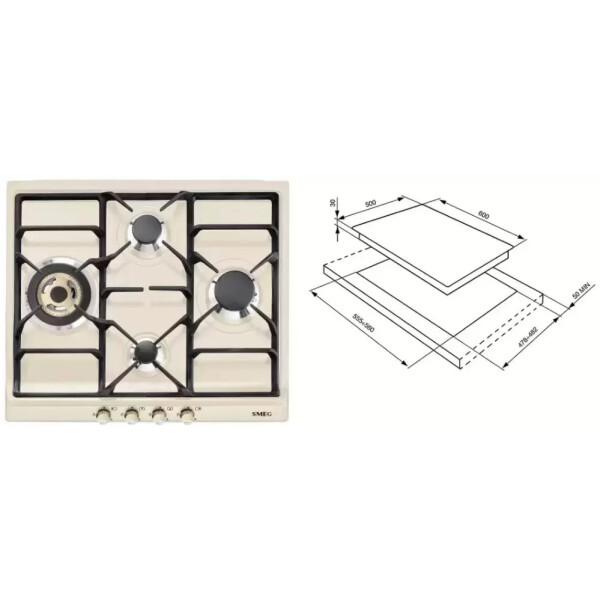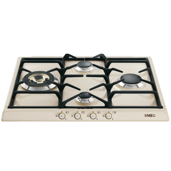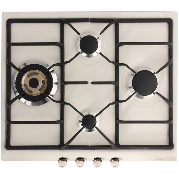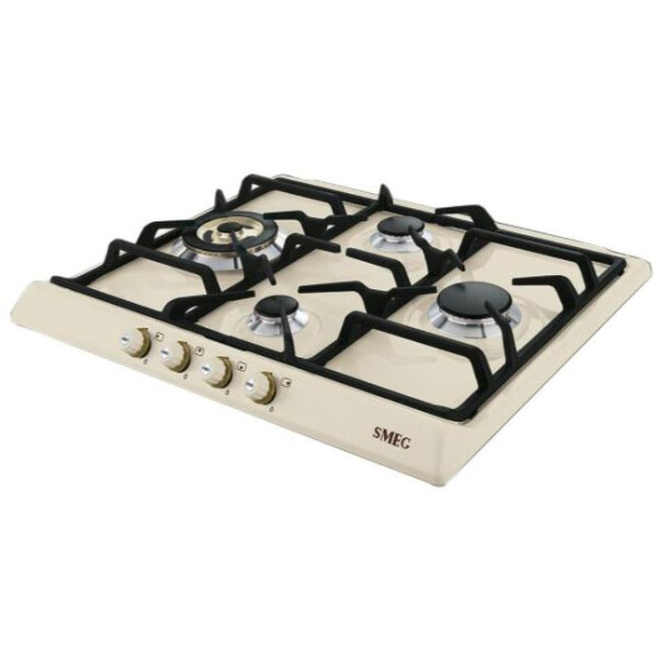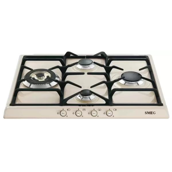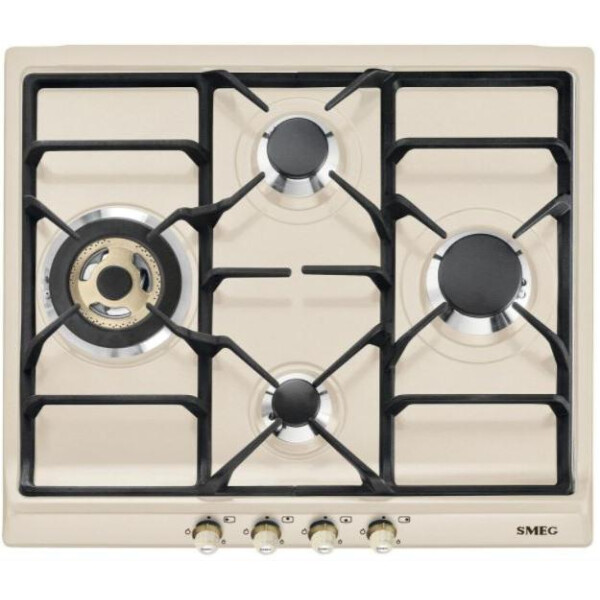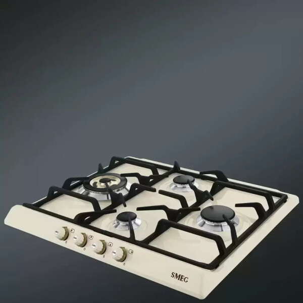 Smeg SR764PO — газовая варочная поверхность с эмалированной панелью конфорок кремового цвета. Модель дополнена чугунными решетками для надежного удержания посуды. Автоматический электроподжиг обеспечивает удобство при активации горелок. Система защиты от утечек гарантирует безопасность при эксплуатации устройства.
