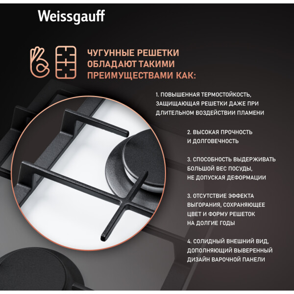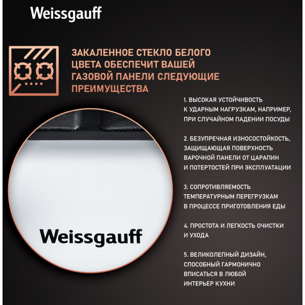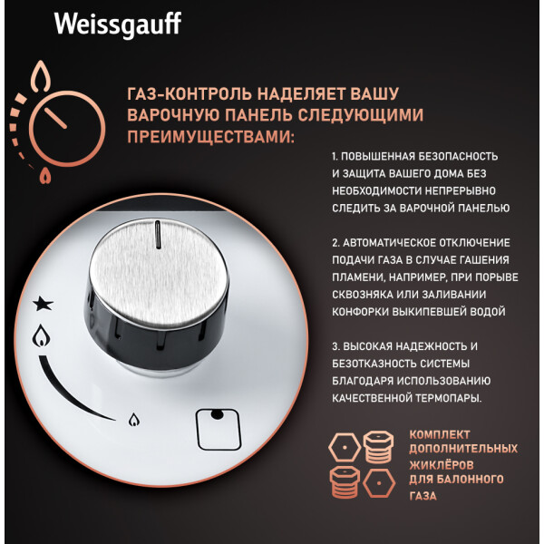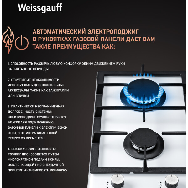Газовая панель Weissgauff, оснащенная системами Газ-контроль и Автоматический электроподжиг - это наиболее технологичное решение среди всех моделей коллекции Домино, в дизайне газ на белом стекле.