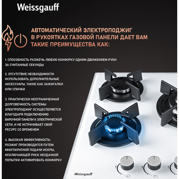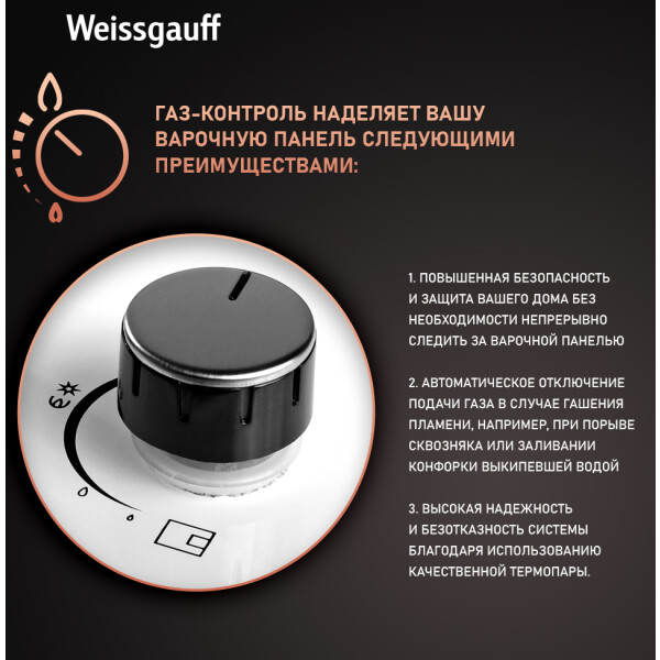 В каждую конфорку газовой панели Weissgauff встроена система Газ-контроль, немедленно прекращающая подачу газа в случае угасания пламени. Это обеспечит вашу безопасность в тех ситуациях, когда огонь гаснет под порывом ветра вследствие сквозняка или из-за убегания жидкости из стоящей на конфорке посуды.