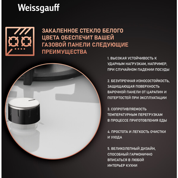 Закаленное и огнеупорное стекло - это основа газовой панели. Именно поэтому Weissgauff подходит к его выбору с поистине немецкой требовательностью к качеству. Материал, который производитель использует в варочных панелях, с достоинством выдерживает агрессивные механические воздействия, стойко переносит контакты с химическими средствами для чистки поверхностей и уверенно справляется с продолжительной работой при непрерывном поддержании высокой температуры пламени. И это не говоря о том, что оно выглядит действительно красиво и стильно, позволяя вам испытывать истинное удовольствие от процесса приготовления еды.