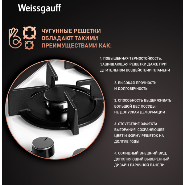 Weissgauff уделяет огромное внимание каждой детали, ведь когда мы говорим о выборе газовой панели, то речь идёт о модели, которой вы будете пользоваться каждый день на протяжение многих лет. Именно поэтому производитель делает так, чтобы выбранная вами варочная поверхность сохранила свой статус и престижный внешний вид даже спустя долгие годы. Чугунные решётки, которыми производитель оснащает газовые панели, дают вам сразу ряд преимуществ, среди которых: значительная сопротивляемость изгибу при воздействии большого веса тяжёлой посуды; надёжная степень прилегания решетки к поверхности панели, что обеспечивает устойчивость; высокая сопротивляемость длительному воздействию высоких температур; впечатляющая защита от сколов и царапин, которая достигается благодаря структуре самого материала; современный внешний вид, который гармонично дополняет дизайн варочной панели.