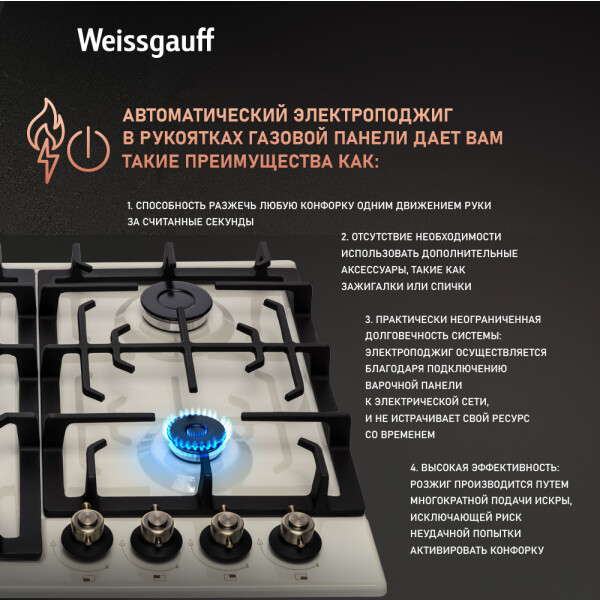 Автоматический электроподжиг, независимо встроенный в каждую из рукояток, позволит зажечь любую конфорку за считанные мгновения, всего одним нажатием и поворотом руки, не прибегая к дополнительным приспособлениям.