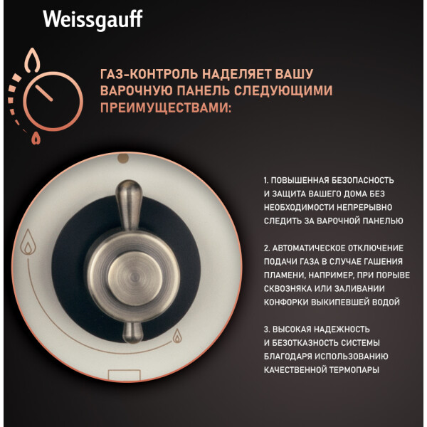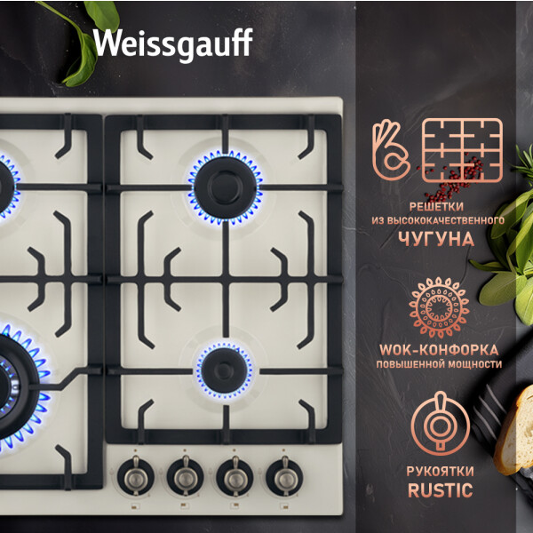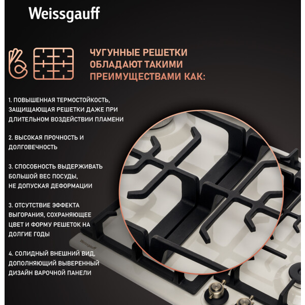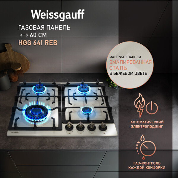 Варочная панель Weissgauff HGG 641 REB шириной 60 см, оснащенную 4 эффективными конфорками, решетками из высококачественного чугуна и системой безопасности газ-контроль. Дизайн, исполненный в бежевой эмалированной стали, дополнит безупречный облик модели, сделав её не только практичным решением для приготовления любого блюда, но и настоящей жемчужиной в интерьере вашей кухни. Ширина 60 см позволит установить газовую панель Weissgauff даже в самую небольшую и компактную кухню.