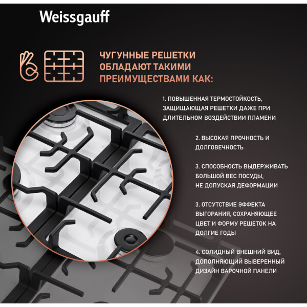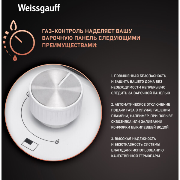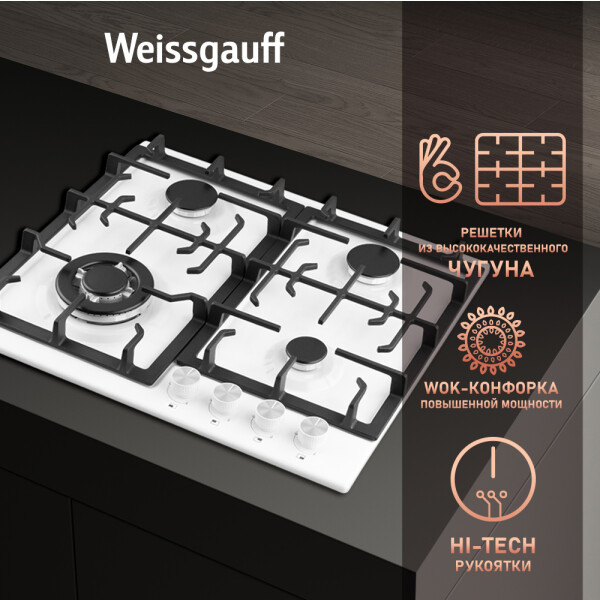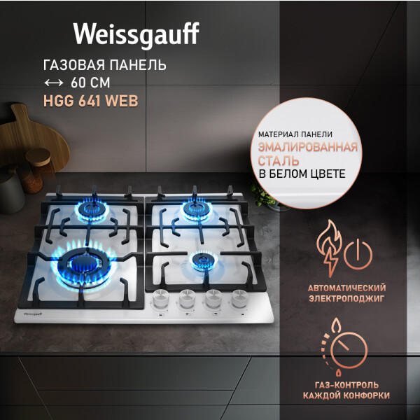 Варочная панель Weissgauff HGG 641 WEB шириной 60 см, оснащенную 4 эффективными конфорками, решетками из высококачественного чугуна и системой безопасности газ-контроль. Дизайн, исполненный в белой эмалированной стали, дополнит безупречный облик модели, сделав её не только практичным решением для приготовления любого блюда, но и настоящей жемчужиной в интерьере вашей кухни. Ширина 60 см позволит установить газовую панель Weissgauff даже в самую небольшую и компактную кухню.